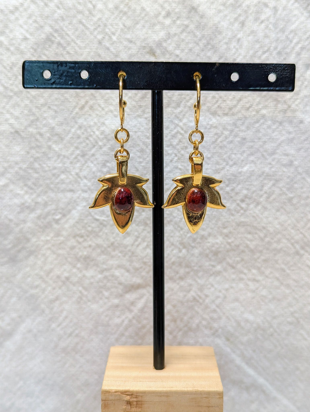 Ces boucles d'oreilles apportent une touche de nature et d'élégance à votre tenue. Elles sont composées d'une feuille en laiton, dont le cœur est orné d'un émail rouge vibrant. Le type d'attache est une puce d'oreille en laiton doré, assurant confort et sécurité tout au long de la journée.