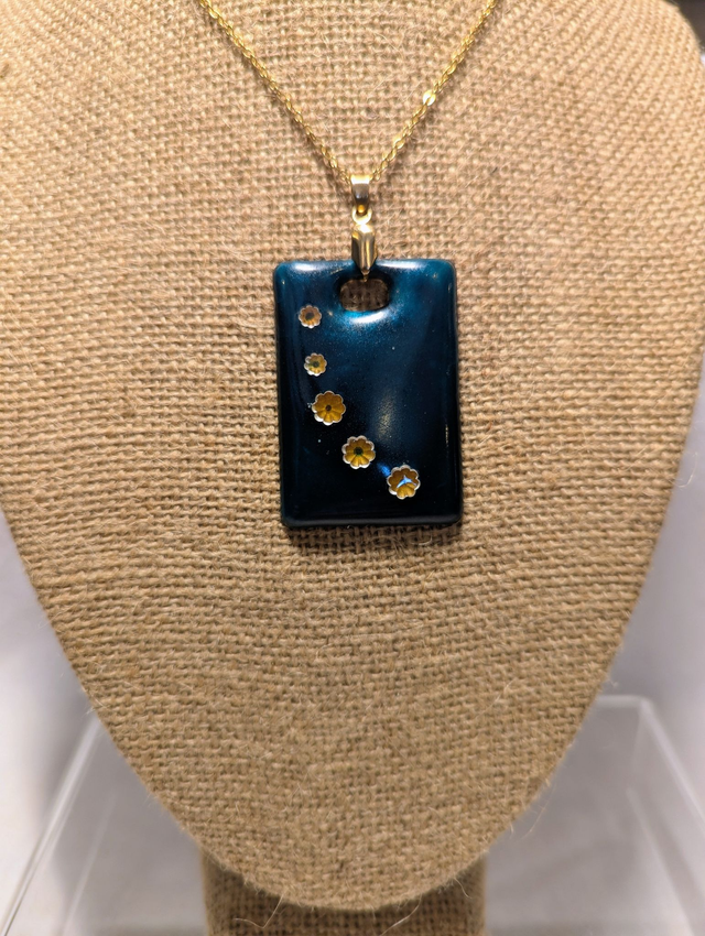Le pendentif est réalisé en émail sur cuivre, une technique qui permet de donner des couleurs éclatantes et une finition lisse et brillante à la pièce.
